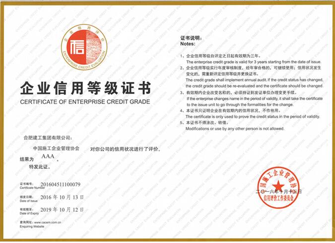 2016AAA企业信用等级证书