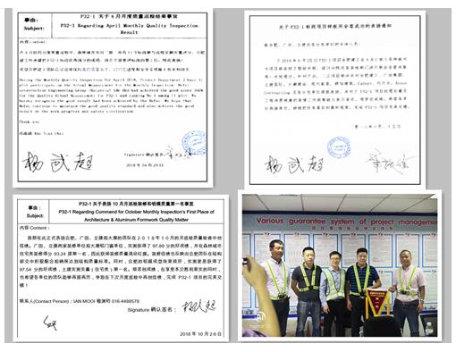 千锤百炼、修得正果,经全体管理团队的认真履职,马来西亚公司多次在全区总包单位各项评比中获得好评。碧桂园海外事业部森林城市对所有参建总包的考核采用履约信用评分制度,2018年对我司的履约信用评分从第一季度D,提升为第二季度C,直至第三季度B,实现三个季度三次跨越,达到碧桂园海外项目土建装饰总包服务商竞标条件。此外多次致表扬信于我司,并授予锦旗作为嘉奖,为日后双方海外战略合作关系奠定坚实的基础,同时,作为合肥建工在海外的第一个总承包项目,我们完美诠释了合肥建工安全、高质的品牌形象。