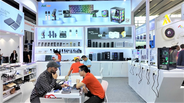 在电子消费品类展区,安粮推出了不同款式的散热机箱,再加上融入人体工程学设计的配套键鼠,能满足不同PC DIY的需求。此外,大容量、多接口、充电快的移动电源,也引得不少意向客户纷纷下订。